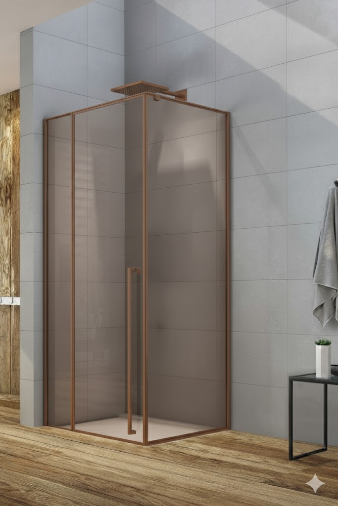 Geef je badkamer een exclusieve en moderne uitstraling met de Saniluxe douchecabine 90x90x195 cm in stijlvolle brons afwerking zowel de hendels als het glas. Het subtiele metallic grijs zorgt voor een luxe en eigentijdse look die perfect past bij industriële en moderne badkamers.